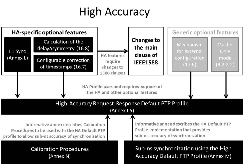 The HA Profile requires implementation of a set of optional features introduced the IEEE1588-2019. These features provide protocol support for the WR enhancements and hardware to achieve sub-ns accuracy of synchronisation.  The features based on WR and required by the HA Profile are: